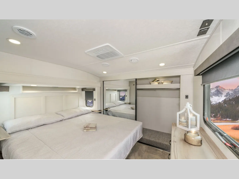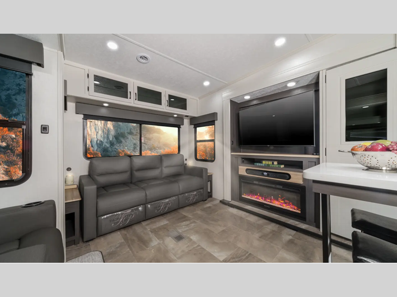 The Tri-Tex powder coated frame technology is up to 5X more weather resistant, and the Road Armor suspension by Trail Air will make towing easier than ever. There is also a Solar Source+ solar package that will provide you with off-grid capabilities! There are many new features that are sure to catch your eye, along with new decor options, an upgraded Carbon and Walnut entertainment center, an upgraded heat pump on all factory installed GE A/Cs and more!
