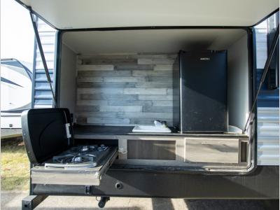 You won't believe all that this travel trailer has to offer! There is a kitchen island with a chair on either side of it for two helpers to roll out the dough for cinnamon rolls in the morning and enjoy them at the U-shaped dinette. One of the entrance doors leads right into the half bathroom which also leads into the rear private bunkhouse. Inside the bunkhouse is a flip-up bunk above the jackknife sofa which are both across from a second bunk and wardrobe/entertainment center. While the kids are busy playing in their bedroom, you and your spouse can relax on the jack knife sofa across from the fireplace or head to the front private bedroom to relax on the RV queen bed, plus you have your own entrance into the walk-through bathroom which will come in very handy at night!