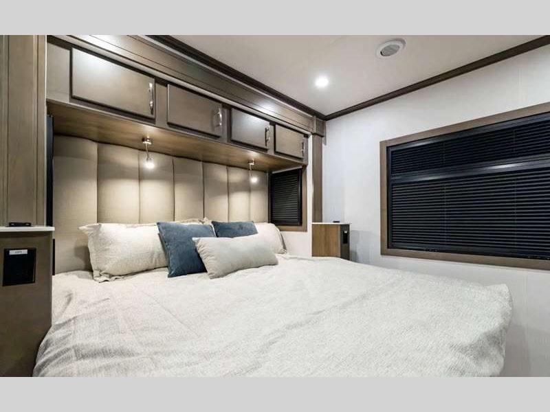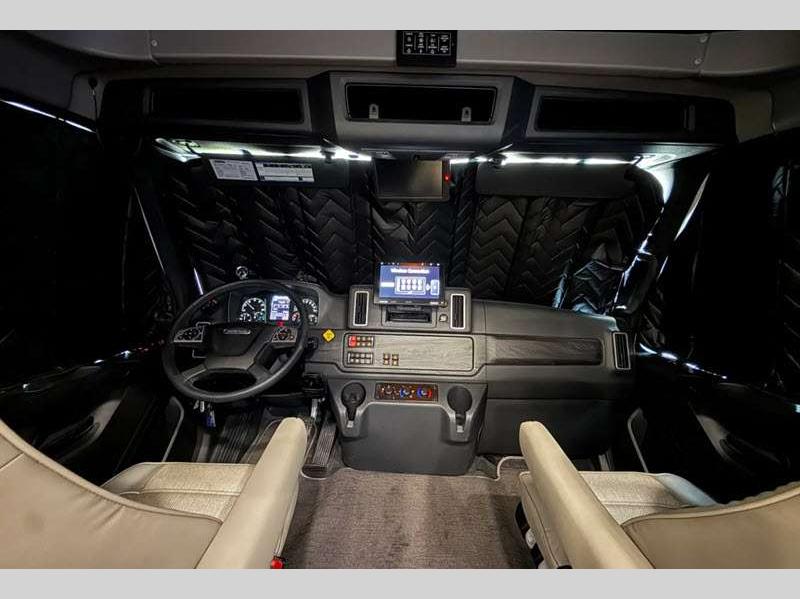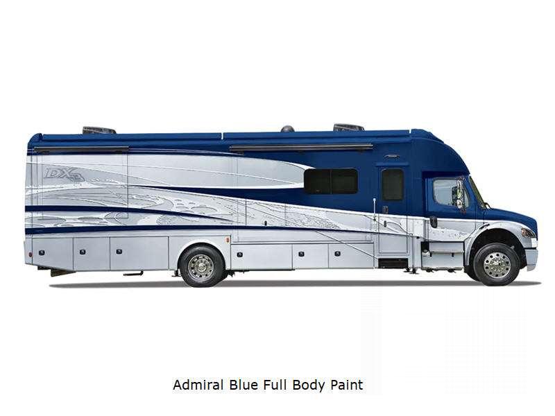 Sleeps 5 Slides 2 Length 33 ft 10 in Ext Width 8 ft 5 in Ext Height 12 ft 9 in Interior Color Saddle, Milano II Exterior Color Admiral Blue, Magnetic Full Body Paint Choices or Opt. Xplorer in Light or Dark Full Body Paint Hitch Weight 20000 lbs GVWR 33000 lbs Fresh Water Capacity 98 gals Grey Water Capacity 52 gals Black Water Capacity 52 gals Tire Size 22.5" Generator 8kW Onan Diesel Fuel Type Diesel Engine Cummins L9 Chassis Freightliner M2 106 Plus Horsepower 360 hp Fuel Capacity 100 gals Wheelbase 245 in Available Beds King Torque 1150 ft-lb Refrigerator Type Residential with Ice Maker Refrigerator Size 16 cu ft Convection Cooking Yes Cooktop Burners 2 Number of Awnings 1 Axle Weight Front 12000 lbs Axle Weight Rear 21000 lbs LP Tank Capacity 20.3 gals Water Heater Type Aqua Hot 400D Diesel AC BTU 30000 btu TV Info LR 42" LED Smart TV, BR 32" LED Smart TV, Ext. 40" LED Smart TV Awning Info 16' Armless with LED Lights and Wind Sensor Washer/Dryer Available Yes Gross Combined Weight 59000 lbs Shower Type Standard Electrical Service 50 amp Similar Floorplans
