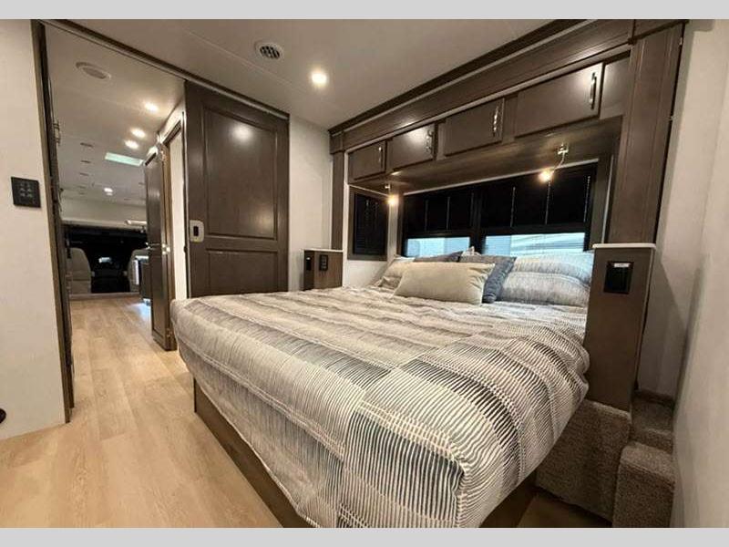 Some of the special features that you'll find on the DX3 are the residential refrigerator with an ice maker, the hardwood cabinetry, the Aqua-Hot 400D diesel hydronic heating system, and the Multiplex wiring with touchscreen command center. Additionally, you'll find many more ultra-accommodating features, like the king bed with gel-infused memory foam mattress for the most comfortable night of sleep, and the exterior wall-mounted entertainment center with LED Smart TV for a night of movie watching underneath the stars.