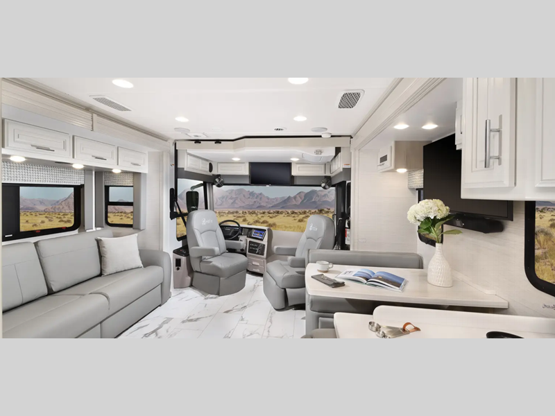 The Tru-Brace Anti-Camber chassis support system, along with the aluminum tube frame with Azdel composite sidewall fiberglass provides a durable foundation so you can enjoy your coach for years. You will love the driver console wireless cellphone charger, and your passenger will have their own stow away workstation to keep them busy on the way to the campground. Some of the interior luxuries you are sure to love are the polished porcelain tile throughout, the decorative window valances, and the polished solid surface countertops with mosaic tile backsplash!