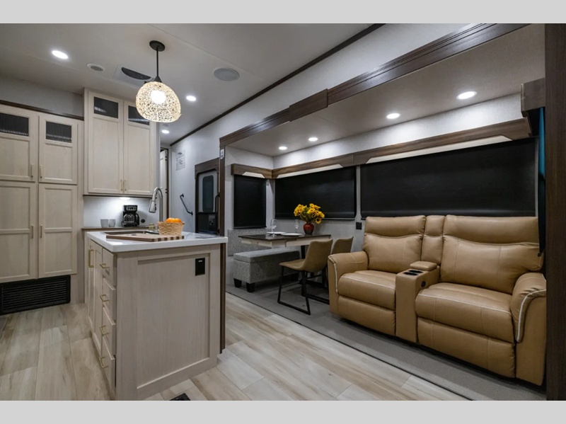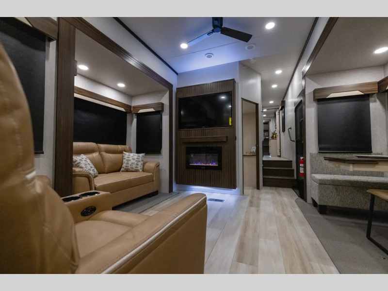 Sleeps 6 Slides 4 Length 43 ft 5 in Ext Width 8 ft 5 in Ext Height 13 ft 3 in Hitch Weight 2855 lbs GVWR 16855 lbs Dry Weight 14704 lbs Cargo Capacity 2151 lbs Fresh Water Capacity 75 gals Grey Water Capacity 82 gals Black Water Capacity 82 gals Available Beds Two King Beds Refrigerator Type 12V with Icemaker Refrigerator Size 18 cu ft Cooktop Burners 3 Number of Awnings 1 Axle Weight 8000 lbs Water Heater Capacity 60000 gal Water Heater Type Tankless AC BTU 30000 btu TV Info LR Smart TV w/Swing Arm, BR 32" Smart TV Awning Info 15' Axle Count 2 Washer/Dryer Available Yes Shower Type Shower w/Seat Similar Floorplans