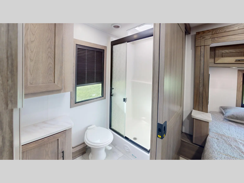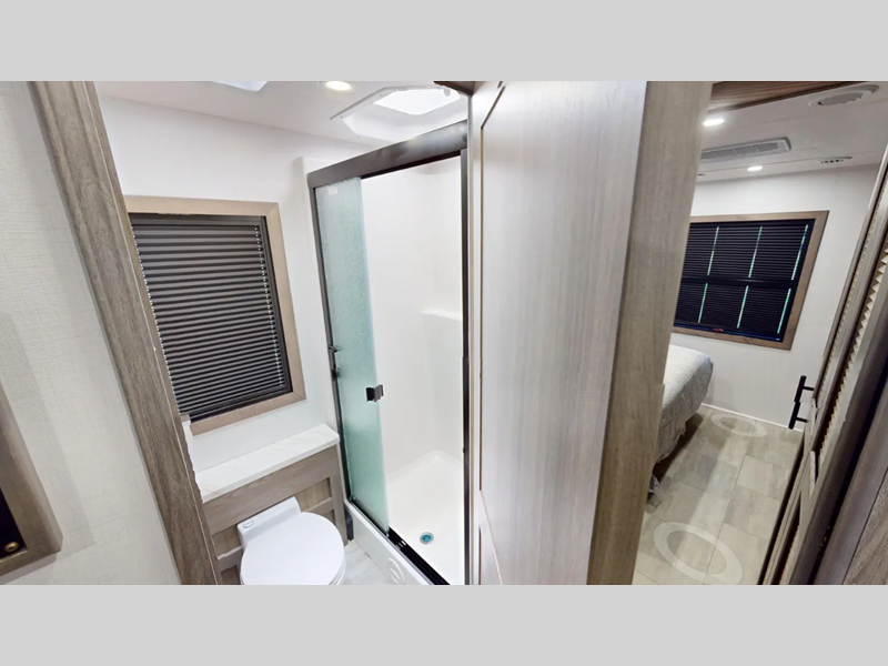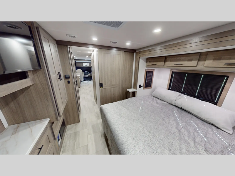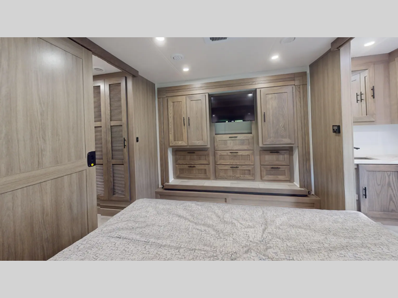 The vacuum bonded construction means you can enjoy traveling in this coach for years to come, and there is a SUPER STORAGE pass-through rear cargo compartment so nothing gets left behind. You'll love the flush floor construction inside with no steps into the cockpit, and there are 7' interior ceilings that will have your space feeling more like home. Some of the systems you'll find convenient are the hydraulic 4-point auto leveling jacks, Go Power solar panels, and a Forest River command center to easily manage your coach's functions.