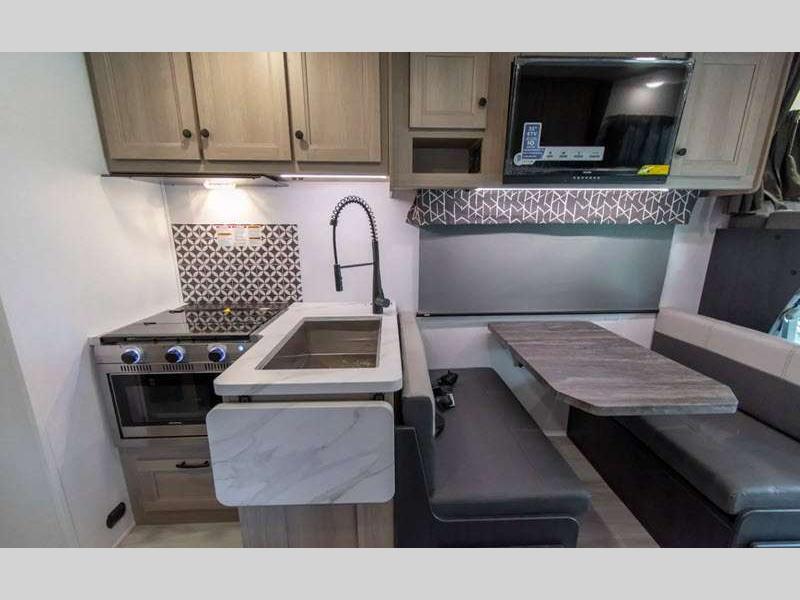 Sleeps 5 Slides 1 Length 23 ft 10 in Ext Width 8 ft 5 in Ext Height 11 ft 3 in Hitch Weight 5000 lbs GVWR 12500 lbs Fresh Water Capacity 35 gals Grey Water Capacity 32 gals Black Water Capacity 27 gals Furnace BTU 30000 btu Generator 4.0KW Gas Fuel Type Gas Chassis Ford E350 Fuel Capacity 55 gals Wheelbase 158 in Number Of Bunks 1 Available Beds Queen Refrigerator Type 12V Refrigerator Size 10.7 cu ft Convection Cooking Yes Cooktop Burners 3 Shower Size 24" x 32" Number of Awnings 1 Axle Weight Front 5000 lbs Axle Weight Rear 8500 lbs LP Tank Capacity 41 lbs Water Heater Capacity 6 gal Water Heater Type DSI Gas/Electric AC BTU 13500 btu TV Info LR 12V LED TV Awning Info 14' Power with LED Lights Gross Combined Weight 18000 lbs Shower Type Standard Electrical Service 30 amp Similar Floorplans