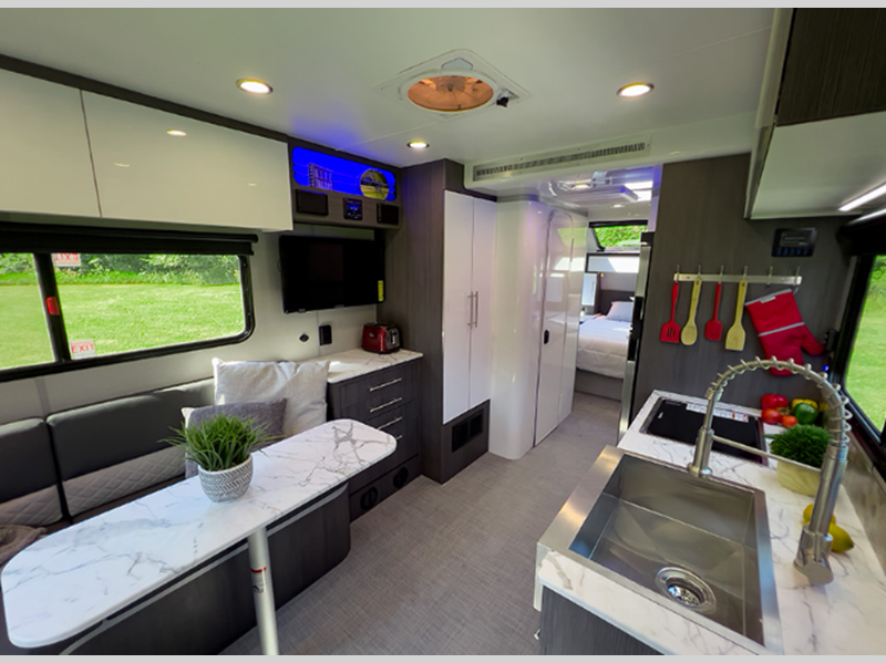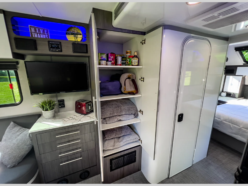 • (4) Drawers, (5) Overhead Cabinets, (1) Overhead Cubbies, Pantry Cabinet, removeable helmet and gear rack (Adventures)