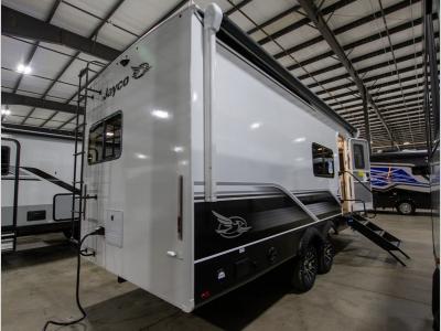 With any Eagle HT fifth wheel or travel trailer by Jayco you will enjoy a smooth drive thanks to the 4 Star Handling Package and MORryde CRE-3000 rubberized suspension. The Customer Value Package includes amenities that are sure to make camping easier than ever, like the 60K on-demand water heater, Keyed-Alike lock system, 15,000 BTU "Whisper Quiet" A/C, and more. Handcrafted door/drawer fronts will make your space feel more like home, along with residential vinyl flooring throughout, GE appliances, and blackout roller shades with reflective side throughout to keep the sun out when you want to sleep in. Each model also includes a NuVo H2O water treatment system with filters included, interior and exterior "Blue Sync" audio connect with MB Quart Sound for your TV and phone, and 100% no floor vents for added comfort and convenience!