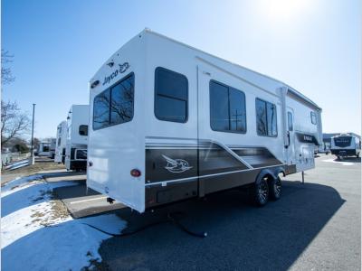 With any Eagle SLE fifth wheel by Jayco, you will enjoy a lighter tow weight, high-end finishes, and the same quality construction you've come to expect from Jayco! There is an Alpha Ply TPO roof membrane, a fully enclosed and heated underbelly, plus Stronghold VBL walls for added durability. There is also a rear 2" towing receiver outside, along with metal slam latch baggage doors, MORryde Step Above entry steps, and a Winegard Air 360 antenna with router prep if you want to stay connected as you camp. Once inside you'll enjoy the handcrafted door/drawer fronts, shower skylight, and residential vinyl flooring throughout with no carpet for an easier clean. The on-demand water heater, 30K BTU furnace, and 15K BTU "Whisper Quiet" A/C will ensure your comfort, and the Overland 1 Solar Package will provide off-grid capabilities!