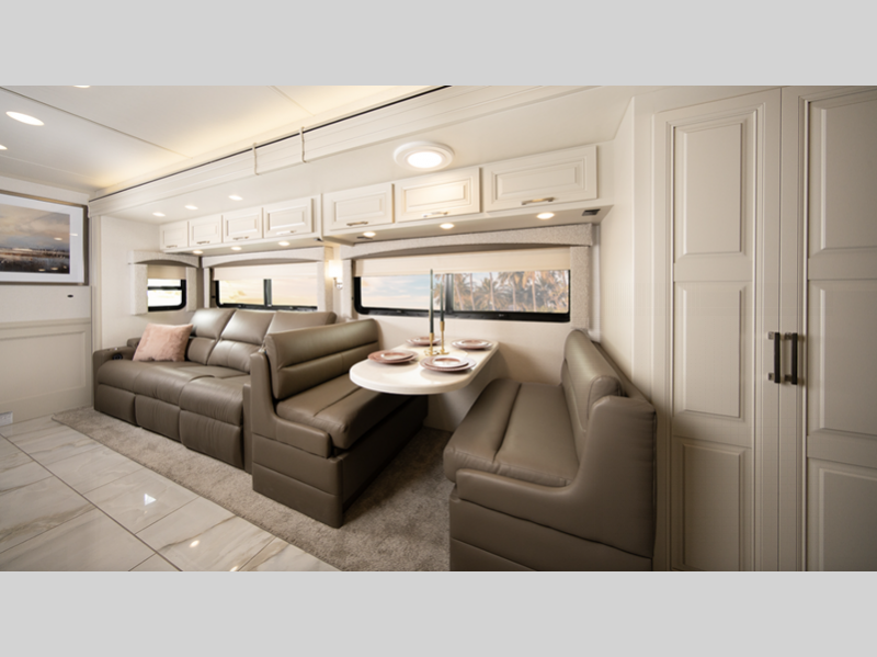 Sleeps 6 Slides 3 Length 39 ft 4 in Ext Width 8 ft 5 in Ext Height 13 ft 4 in Int Height 7 ft Interior Color Fieldstone, Mountain Peak, Saddle Exterior Color Beacon Blue, Breezy Blue, Radiant Silver, Rosy Garnet, Dark Knight Full-Body Paint Choices Hitch Weight 12000 lbs GVWR 31000 lbs Fresh Water Capacity 72 gals Grey Water Capacity 80 gals Black Water Capacity 50 gals Tire Size 275/80R22.5G Generator 8,000W Diesel Fuel Type Diesel Engine Cummins ISB 6.7L Chassis Freightliner S2RV Plus Horsepower 360 hp Fuel Capacity 100 gals Wheelbase 279 in Number Of Bunks 1 Available Beds King Torque 800 ft-lb Refrigerator Type Stainless Steel Residential Convection Cooking Yes Cooktop Burners 2 Shower Size 30" x 36" Number of Awnings 1 Water Heater Type Aqua Hot 250D Hydronic AC BTU 30000 btu Basement Storage 152 cu. ft. TV Info LR 50" LED TV, BR 32" LED TV, Exterior LED TV Awning Info 19' 8" Roof-Mounted Girard w/LED Lights Washer/Dryer Available Yes Gross Combined Weight 43000 lbs Shower Type Standard Electrical Service 50 amp Solar Wattage 200 watts Similar Floorplans