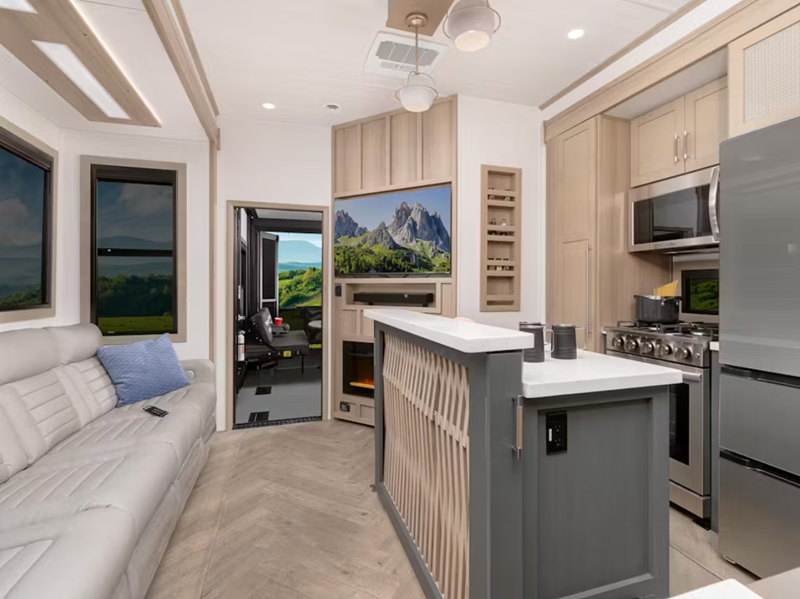 Sleeps 7 Slides 3 Length 39 ft 6 in Ext Height 13 ft 3 in Interior Color Galaxy, Loam Hitch Weight 3475 lbs Dry Weight 15890 lbs Cargo Capacity 3585 lbs Fresh Water Capacity 173 gals Grey Water Capacity 104 gals Black Water Capacity 104 gals Tire Size 215/75R17.5H Furnace BTU 35000 btu Generator Onan 5,500W Gas Fuel Capacity 60 gals Number Of Bunks 1 Available Beds King Refrigerator Type 12 Volt Refrigerator Size 20 cu ft Convection Cooking Yes Cooktop Burners 4 Shower Size 42" X 30" Number of Awnings 3 Axle Weight 8000 lbs Garage Size 11 ft LP Tank Capacity 30 lbs Water Heater Type Girard Tankless On Demand TV Info LR 50" Smart LED TV, BR Smart LED TV, Garage 40" Smart LED TV, Ext. 50" TV Awning Info 10', 8' & 13' Girard Cassette Electric with LED Lights Axle Count 3 Washer/Dryer Available Yes Number of LP Tanks 2 Shower Type Standard Electrical Service 50 amp Similar Floorplans