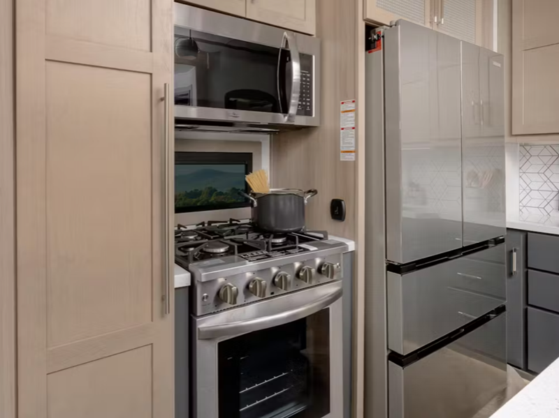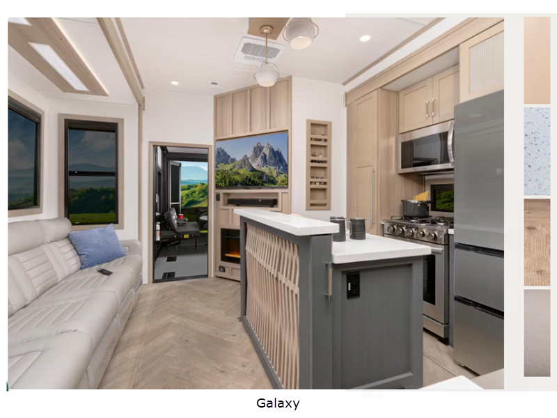 Sleeps 9 Slides 3 Interior Color Galaxy, Loam Furnace BTU 35000 btu Generator Onan 5500W Fuel Capacity 60 gals Number Of Bunks 1 Available Beds King Refrigerator Type 12 Volt Refrigerator Size 20 cu ft Convection Cooking Yes Cooktop Burners 4 Shower Size 42" x 30" Number of Awnings 3 Axle Weight 8000 lbs Garage Size 13 ft LP Tank Capacity 30 lbs Water Heater Type Girard Tankless On Demand TV Info LR 50" Smart LED TV, BR Smart LED TV, Garage 40" Smart TV Awning Info 10', 13' & 13' Girard Cassette Electric with LED Lights Axle Count 3 Washer/Dryer Available Yes Number of LP Tanks 2 Shower Type Standard Electrical Service 50 amp Similar Floorplans