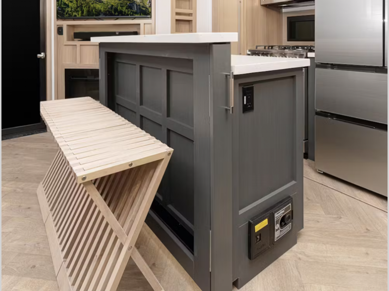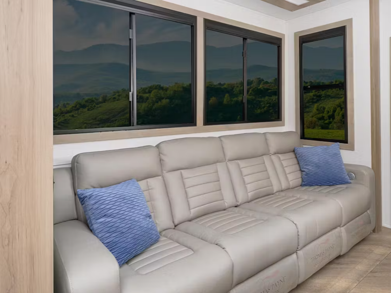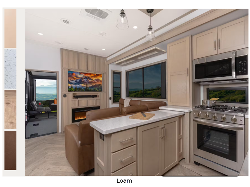 The MaxTurn technology with a Helux pin box will make towing easier than ever, and the 6-point hydraulic leveling system will have you set up at camp in no time! With a HappiJac bunk system on all models, they are ideal for families who like to go off the beaten path. You'll also love designer style vinyl flooring throughout, solid surface countertops, Thomas Payne furniture, and one-piece shower surrounds to name a few interior comforts.
