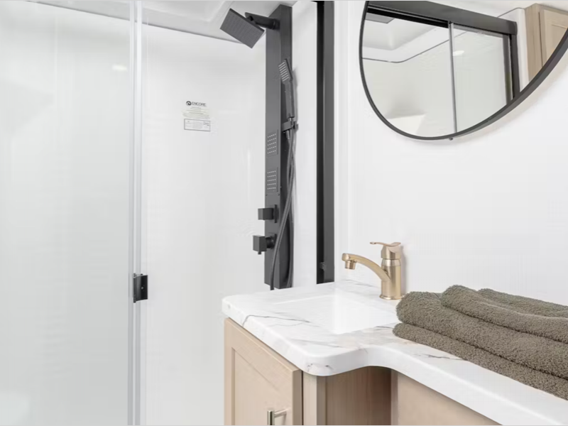 - Fiberglass 1-piece shower surround, removable shower head, built-in skylight