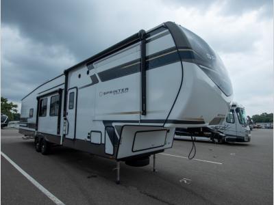 The Sprinter fifth wheels by Keystone feature spacious living areas, plenty of storage, and outstanding towability. Each unit is constructed with 2" aluminum framed and laminated sidewalls, a fully walkable roof, and dual layer insulation to help extend your camping season. The heated pass-through storage includes lockable slam latch baggage doors so you can easily pack your gear, and the one-touch 4-point leveling system features return hookup memory to have you set up in no-time. Head inside to find Congoleum vinyl flooring, Thomas Payne luxury collection furniture, residential style seamless marbled countertops, and an upgraded bedspread to name a few comforts. The Sprinter also includes a Girard tankless on-demand water heater, a central command center, plus a 30k BTU furnace and two A/C units to ensure your comfort!