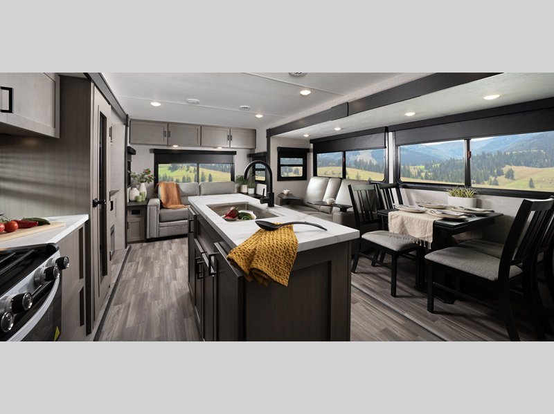 Sleeps 4 Slides 2 Length 36 ft Ext Width 8 ft 1 in Ext Height 11 ft 3 in Int Height 8 ft 1 in Interior Color Washed Driftwood Hitch Weight 1090 lbs GVWR 9300 lbs Dry Weight 7810 lbs Cargo Capacity 1490 lbs Fresh Water Capacity 45 gals Grey Water Capacity 58 gals Black Water Capacity 29 gals Tire Size ST225/75R15E Furnace BTU 30000 btu Available Beds King Refrigerator Type 12 Volt Refrigerator Size 10 cu ft Cooktop Burners 3 Shower Size 36" x 30" Number of Awnings 2 LP Tank Capacity 30 lbs Water Heater Capacity 6 gal Water Heater Type Gas/Electric AC BTU 15000 btu TV Info LR Smart HDTV Awning Info 13' and 15' Power with LED Lighting Axle Count 2 Washer/Dryer Available Yes Number of LP Tanks 2 Shower Type Standard Electrical Service 50 amp Solar Wattage 200 watts Similar Floorplans