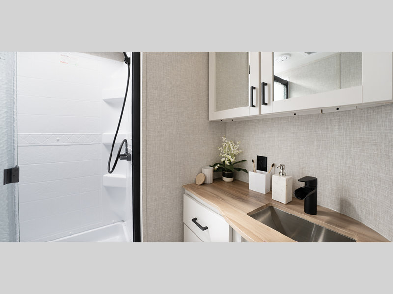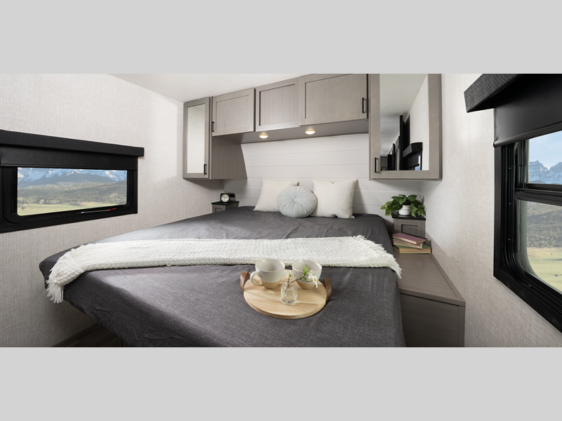 Sleeps 2 Slides 2 Length 32 ft 4 in Ext Width 8 ft 1 in Ext Height 11 ft 3 in Int Height 6 ft 9 in Interior Color Washed Driftwood Hitch Weight 1029 lbs GVWR 8995 lbs Dry Weight 7560 lbs Cargo Capacity 1435 lbs Fresh Water Capacity 45 gals Grey Water Capacity 58 gals Black Water Capacity 29 gals Tire Size ST225/75R15E Furnace BTU 30000 btu Available Beds King Refrigerator Type 12 Volt Refrigerator Size 10 cu ft Cooktop Burners 3 Shower Size 36" x 30" Number of Awnings 1 LP Tank Capacity 30 lbs Water Heater Capacity 6 gal Water Heater Type Gas/Electric AC BTU 15000 btu TV Info LR Smart HDTV Awning Info 21' Power with LED Lighting Axle Count 2 Washer/Dryer Available Yes Number of LP Tanks 2 Shower Type Standard Electrical Service 50 amp Solar Wattage 200 watts Similar Floorplans